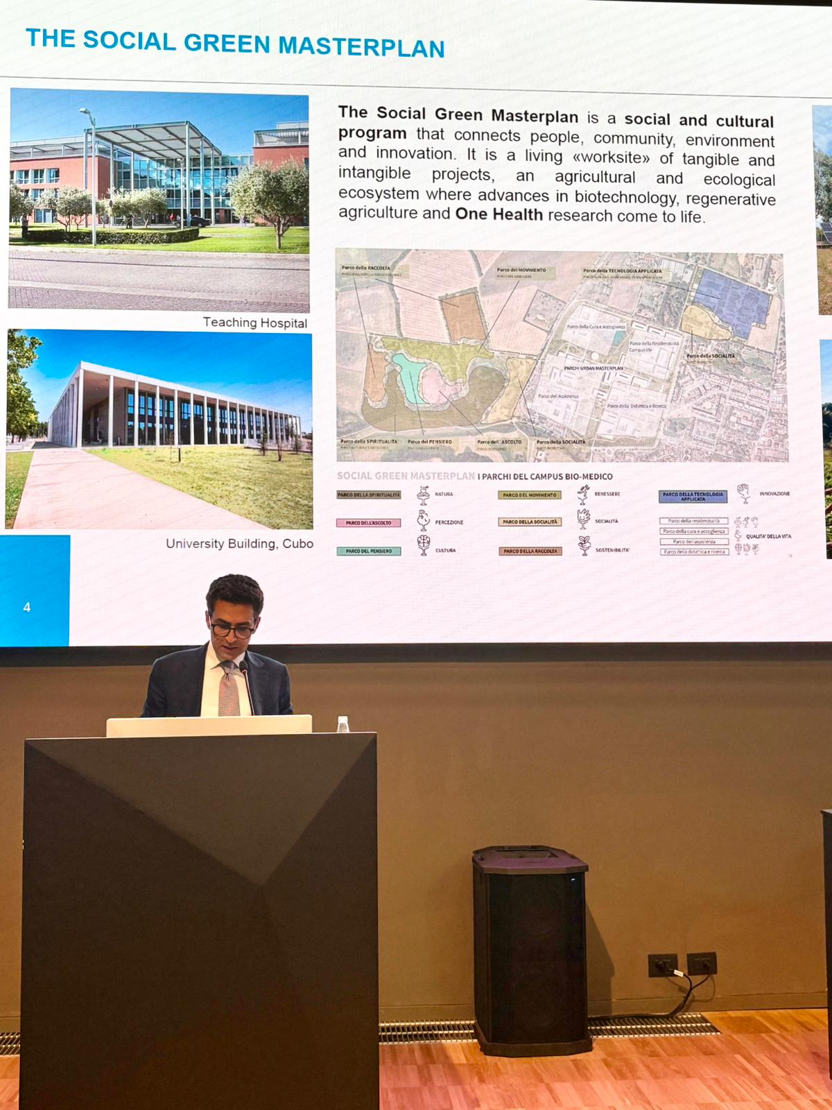 Nel suo intervento il Direttore Generale ha evidenziato le direttrici che guidano la missione del Campus Bio-Medico, il Social Green Masterplan come leva di rigenerazione territoriale e sociale e lo sviluppo del nuovo Agri Hub, espressione di un modello di innovazione sostenibile al servizio della comunità.